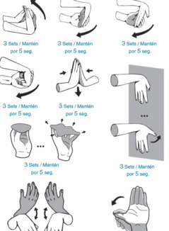 Sostén una mancuerna ligera y gira el antebrazo, alternando palma arriba y abajo.Apretón con pelota o goma blanda
