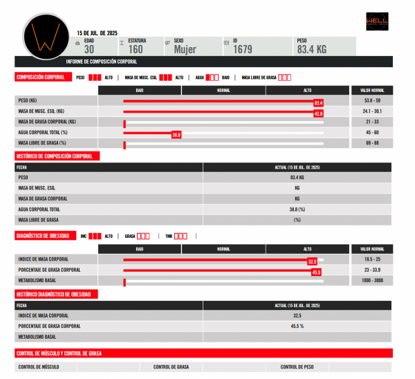 Análisis de peso, masa muscular, grasa corporal y otros parámetros relevantes para establecer objetivos.
